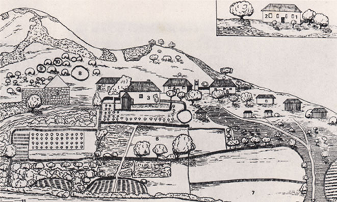 3. Dwelling house of missionary Kayser; alongside a storeroom. At the upper right corner of the sketch, the same house from the opposite side: No 1. Kayser's study; 2. His wife and children's room.