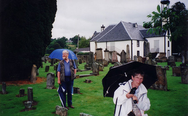 Here we see George Russell and Emily Galvin photographing headstones at the Dalserf Parish Church, churchyard in the historic village of Dalserf in Lanarkshire. Photograph supplied by Betty Rudolph, 2000. |