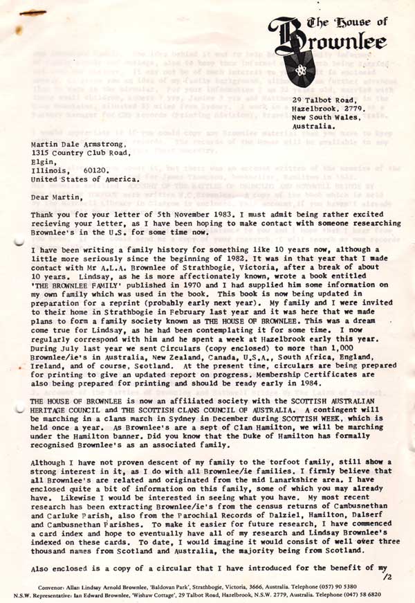 Letter from Ian Edward Brownlee to Martin Dale Armstrong 13 November 1983
