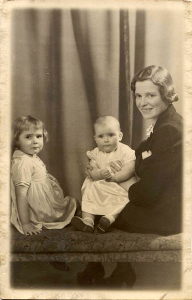Photo 1. Janet Bell Fleming (nee Brownlie) born 1910, with Sheila Isabella Maxwell Eime (nee Fleming) born 1937 at left, and on Janet's knee, Fiona McClymont Cockington (Fleming) born 1940