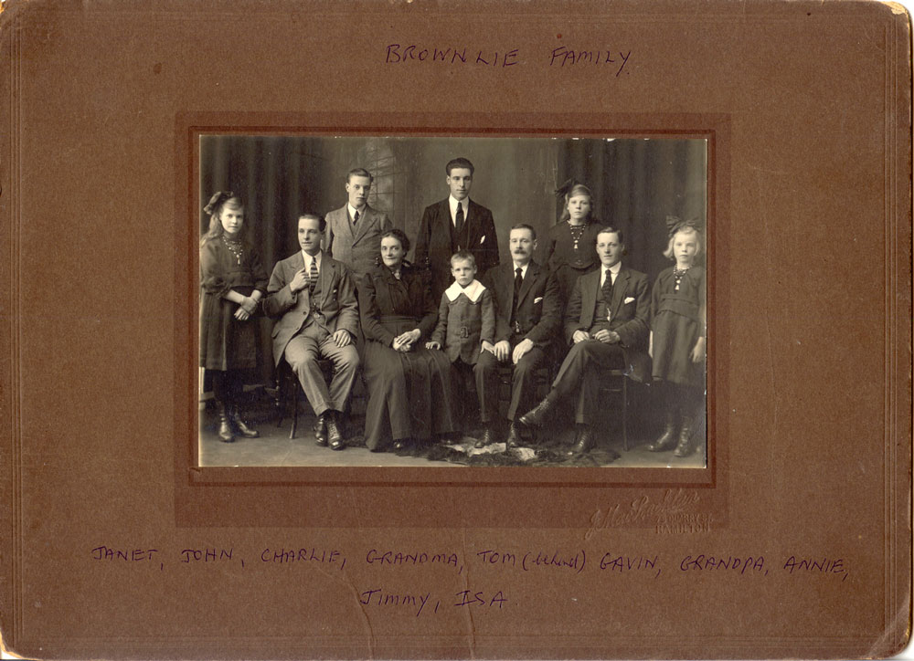 Photo 11. (Back Row) Charles Brownlie born 1907, Thomas Brownlie born 1904 and Annie Brownlie born 1909 (Front Row) Janet Bell Brownlie (nee Brownlie) born 1910, John Brownlie born 1902, Isabella Donaldson Brownlie (nee Maxwell) born 1875, Gavin Brownlie born 1917, John Bell Brownlie born 1870, James Brownlie born 1900, Isabella Donaldson Maxwell Kelso (nee Brownlie) born 1912 - the eight surviving children, taken c 1924.