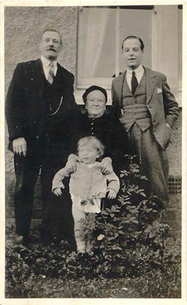 Photo 2. Four generations Janet Brownlie (nee Bell) born 1847 with son John Bell Brownlie born 1870, grandson John Brownlie born 1902 and great granddaughter Norma (?). Photo taken c1920s.