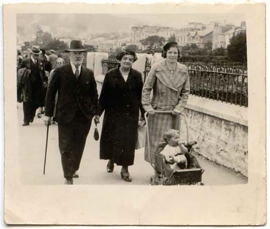 Photo 3. John Bell Brownlie born 1870, Isabella Donaldson Brownlie (nee Maxwell) born 1875 with daughter Janet Bell Fleming (nee Brownlie) born 1910 and in the pram, granddaughter Sheila Isabel Maxwell Eime (nee Fleming) born 1937.