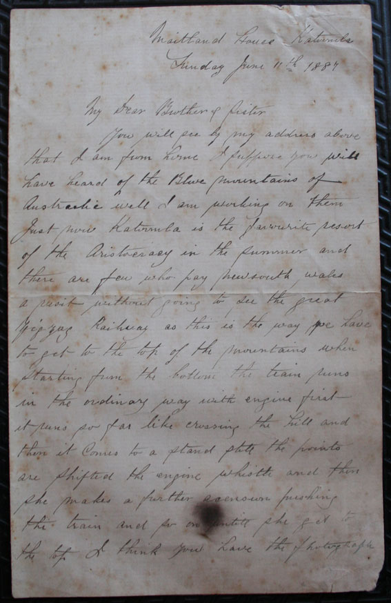 Page 1 of letter from James Brownlee staying at Maitland House in Katoomba NSW to Mary Brownlee in Wishaw