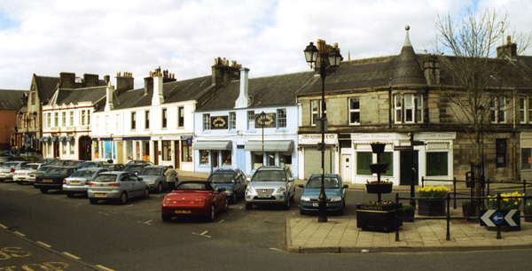 Strathaven town shot - view of North side of Common Green, in the centre of Strathaven Town, showing site of Thomas Brownlie's house and former Flesher's business (building at right on corner) and Gebbie's offices (in centre of photo to left of sky blue coloured building). Photograph © George Russell |
